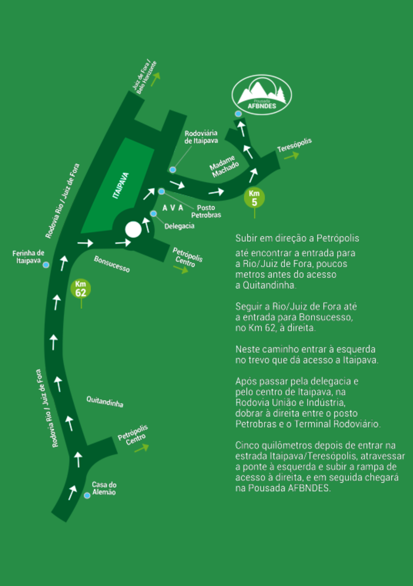 Rodovia Philúvio Cerqueira Rodrigues (estrada Itaipava-Teresópolis, BR 495) nº 5001, Madame Machado, Itaipava, Petrópolis (RJ), CEP 25745-001.