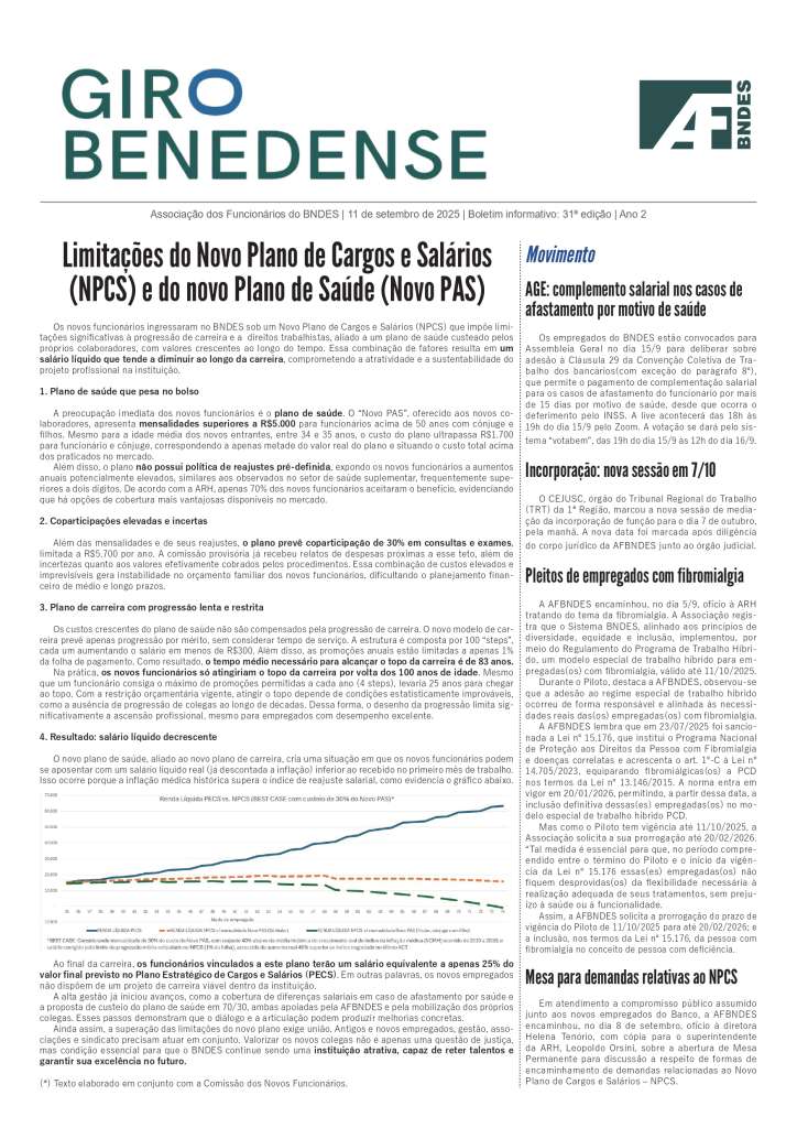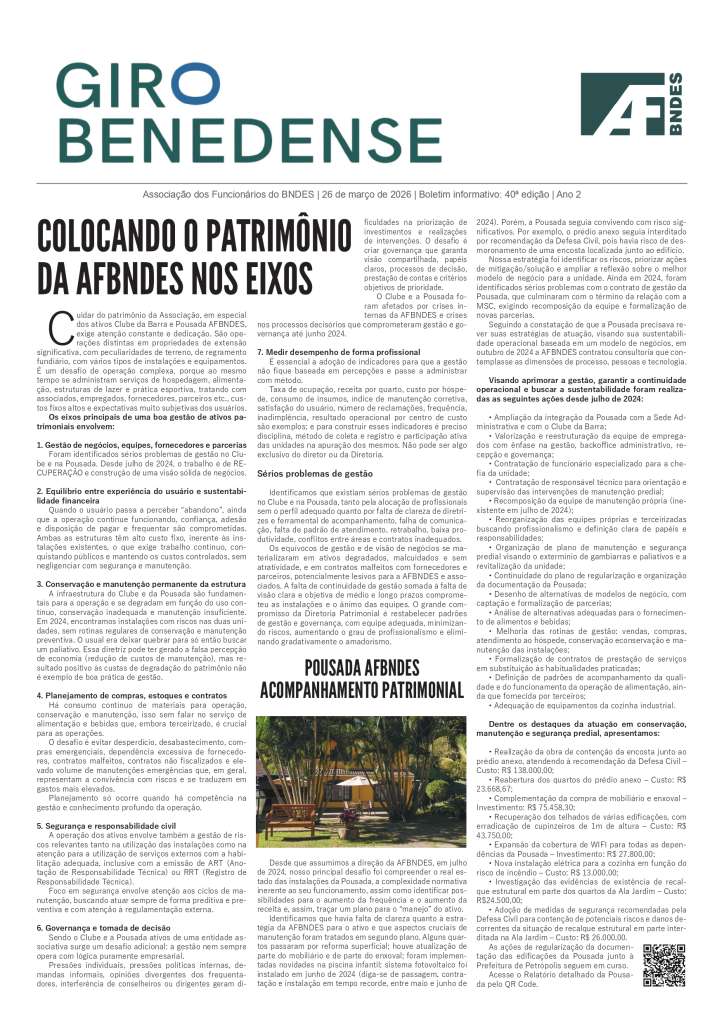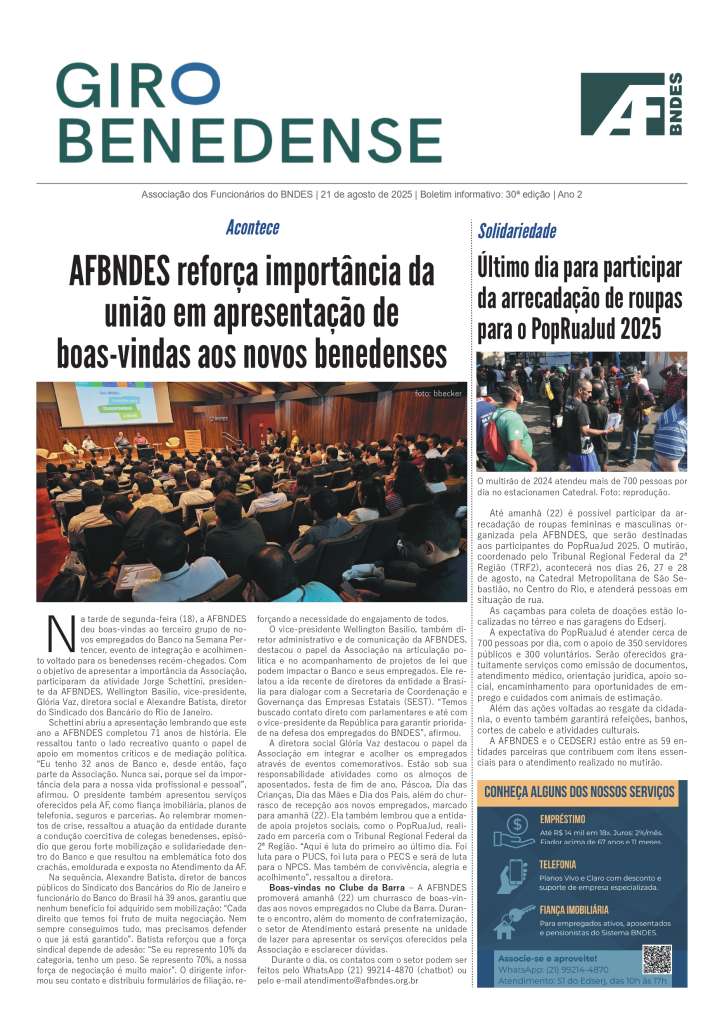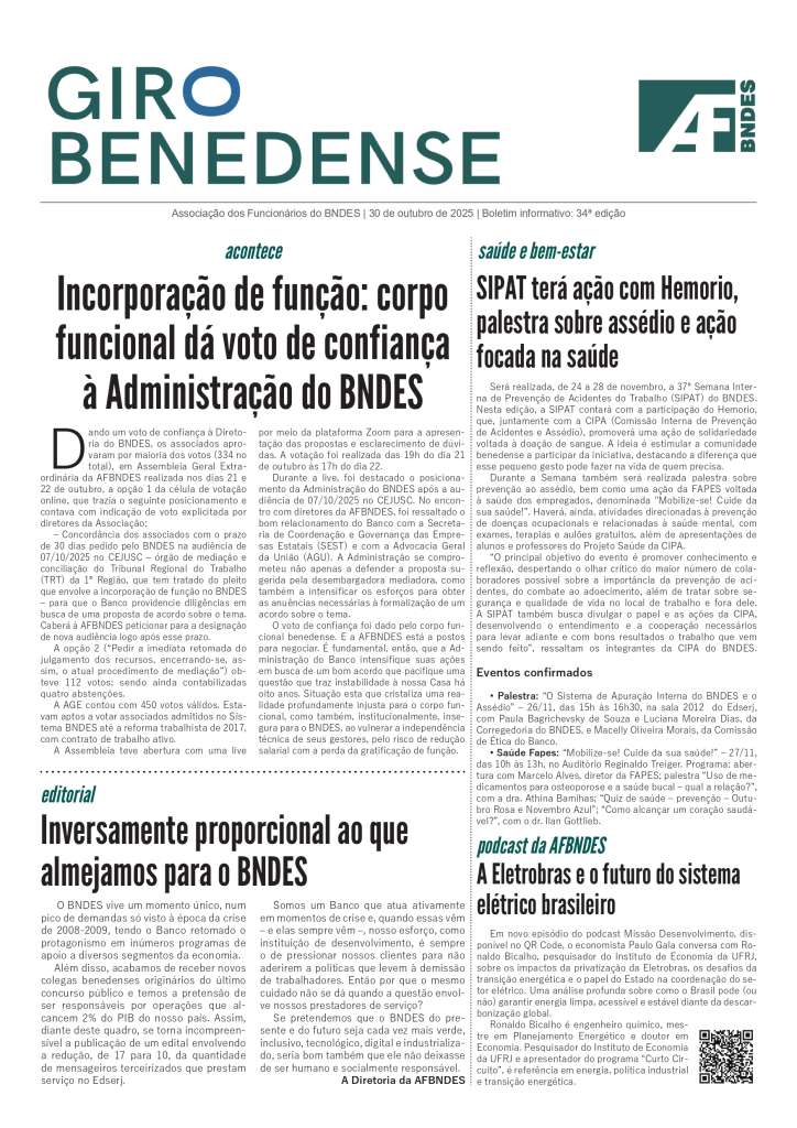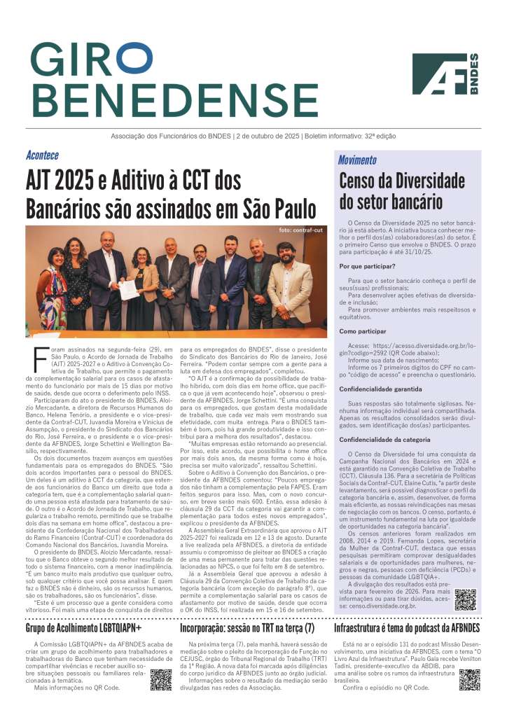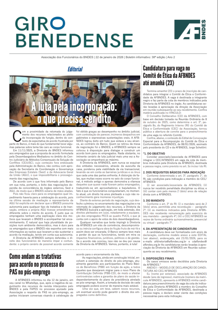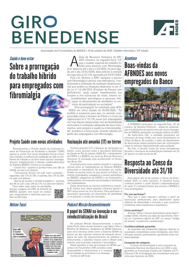 O GIRO BENEDENSE é mais um elemento de comunicação para aproximar os colegas de temas relevantes e do dia a dia da nossa Associação, destacando políticas, eventos e serviços. O boletim estará na sua mesa de trabalho a cada duas semanas, às quintas-feiras, dia do presencial obrigatório no BNDES.