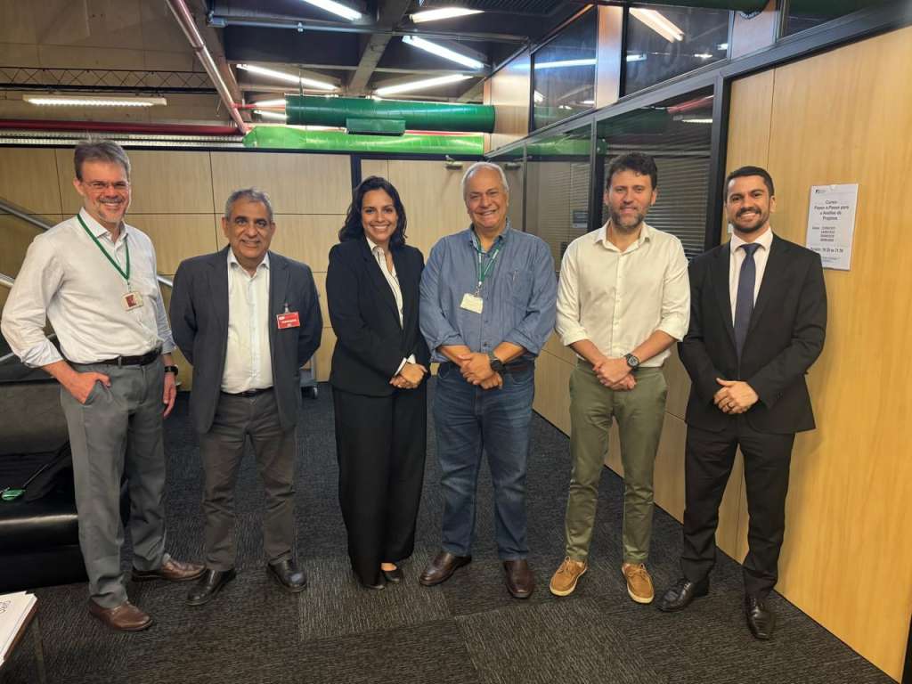 VÍNCULO 1661 – O advogado Cezar Britto (segundo à esquerda) – principal sócio do Escritório CBA e ex-presidente da OAB Nacional – esteve em reunião presencial na AFBNDES na quarta-feira (24), quando foram tratados assuntos de rotina. O escritório é parceiro da Associação nas negociações coletivas dos empregados do BNDES, assim como atuou na arbitragem relativa à PLR de 2022. Também na foto, o diretor jurídico da AFBNDES, Amaro de Oliveira, a advogada Isabela Blanco, do CBA, o presidente e o vice-presidente da Associação, Jorge Schettini e Wellington Basílio, respectivamente, e o advogado Breno Cavalcante, também do Escritório CBA.