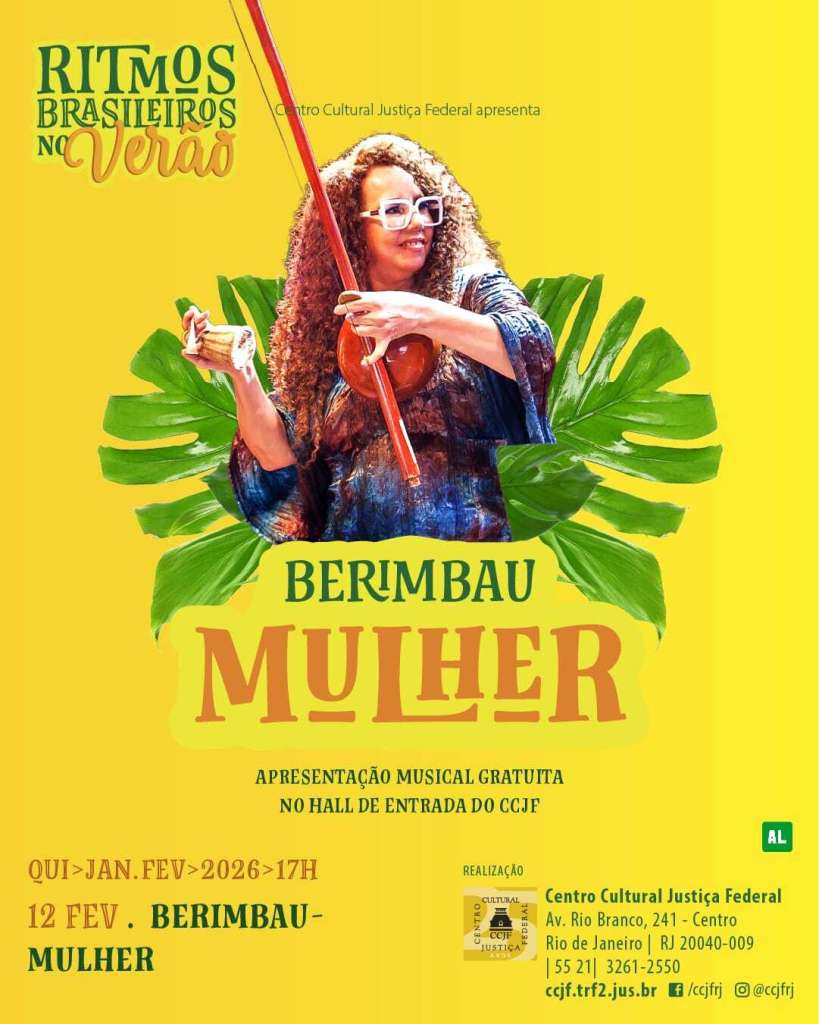 VÍNCULO 1678 – Apresentação do grupo “Berimbau-Mulher” no Centro Cultural Justiça Federal (CCJF). Uma celebração da ancestralidade, da liberdade e da força feminina dentro da capoeira, uma das mais emblemáticas expressões da cultura afro-brasileira. No centro da roda estarão mulheres conduzindo o canto, o coro e tocando os instrumentos sagrados: berimbau, atabaque, pandeiro e agogô. Um encontro poético entre corpo, voz e percussão.
